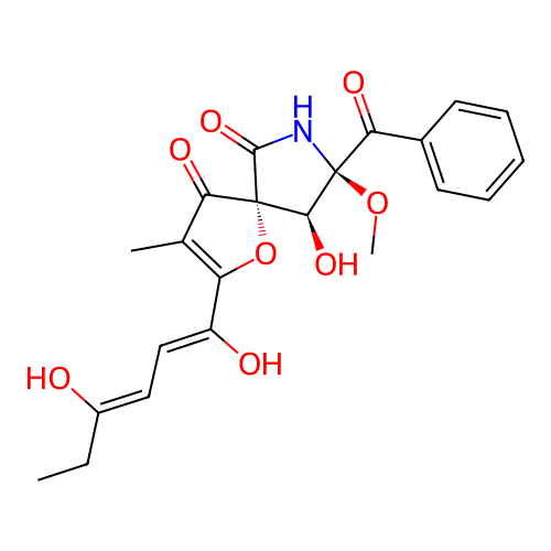 | InChI | InChI=1S/C22H23NO8/c1-4-14(24)10-11-15(25)16-12(2)17(26)21(31-16)19(28)22(30-3,23-20(21)29)18(27)13-8-6-5-7-9-13/h5-11,19,24-25,28H,4H2,1-3H3,(H,23,29)/b14-10-,15-11-/t19-,21-,22-/m0/s1 |