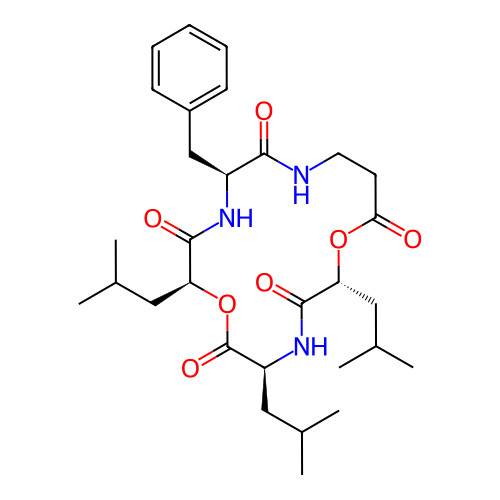 | SMILES | CC(C)C[C@H]1C(=O)O[C@H](C(=O)N[C@H](C(=O)NCCC(=O)O[C@@H](C(=O)N1)CC(C)C)CC2=CC=CC=C2)CC(C)C |