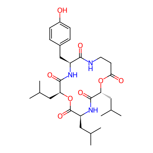 | SMILES | CC(C)C[C@H]1C(=O)O[C@H](C(=O)N[C@H](C(=O)NCCC(=O)O[C@@H](C(=O)N1)CC(C)C)CC2=CC=C(C=C2)O)CC(C)C |