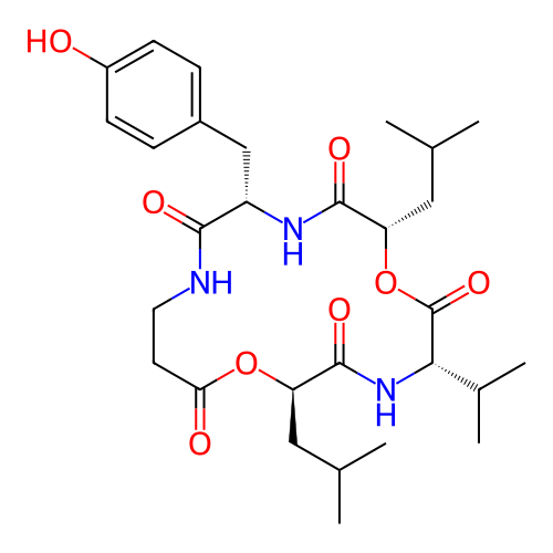 | SMILES | CC(C)C[C@@H]1C(=O)N[C@H](C(=O)O[C@H](C(=O)N[C@H](C(=O)NCCC(=O)O1)CC2=CC=C(C=C2)O)CC(C)C)C(C)C |