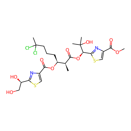| SMILES | C[C@@H]([C@H](CCCC(C)(Cl)Cl)OC(=O)C1=CSC(=N1)[C@@H](CO)O)C(=O)O[C@H](C2=NC(=CS2)C(=O)OC)C(C)(C)O |