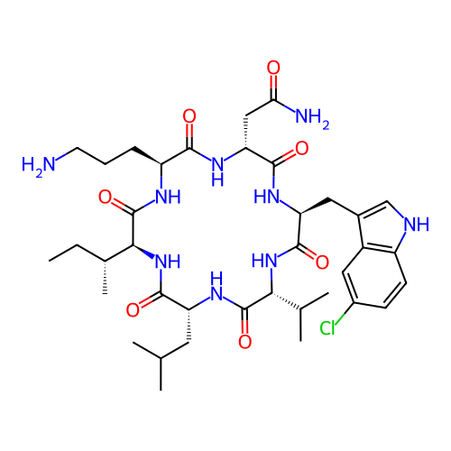 | SMILES | CC[C@@H](C)[C@H]1C(=O)N[C@H](C(=O)N[C@@H](C(=O)N[C@H](C(=O)N[C@@H](C(=O)N[C@@H](C(=O)N1)CC(C)C)C(C)C)CC2=CNC3=C2C=C(C=C3)Cl)CC(=O)N)CCCN |