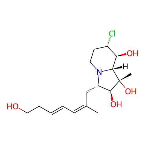 | InChI | InChI=1S/C17H28ClNO4/c1-11(6-4-3-5-9-20)10-13-16(22)17(2,23)15-14(21)12(18)7-8-19(13)15/h3-4,6,12-16,20-23H,5,7-10H2,1-2H3/b4-3+,11-6-/t12-,13-,14+,15+,16-,17-/m0/s1 |