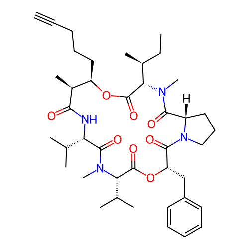 | SMILES | CC[C@H](C)[C@H]1C(=O)O[C@@H]([C@@H](C(=O)N[C@H](C(=O)N([C@H](C(=O)O[C@H](C(=O)N2CCC[C@H]2C(=O)N1C)CC3=CC=CC=C3)C(C)C)C)C(C)C)C)CCCC#C |