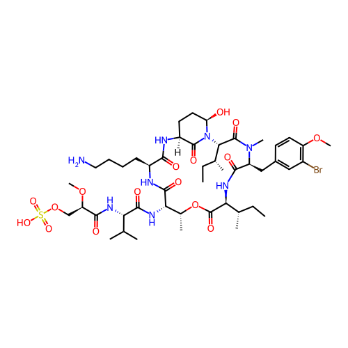 | SMILES | CC[C@H](C)[C@H]1C(=O)O[C@@H]([C@@H](C(=O)N[C@H](C(=O)N[C@H]2CC[C@H](N(C2=O)[C@H](C(=O)N([C@H](C(=O)N1)CC3=CC(=C(C=C3)OC)Br)C)[C@H](C)CC)O)CCCCN)NC(=O)[C@H](C(C)C)NC(=O)[C@@H](COS(=O)(=O)O)OC)C |