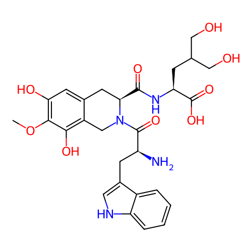 | SMILES | COC1=C(C=C2C[C@H](N(CC2=C1O)C(=O)[C@H](CC3=CNC4=CC=CC=C43)N)C(=O)N[C@@H](CC(CO)CO)C(=O)O)O |