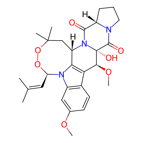 | SMILES | CC(=C[C@@H]1N2C3=C(C=CC(=C3)OC)C4=C2[C@H](CC(OO1)(C)C)N5C(=O)[C@@H]6CCCN6C(=O)[C@]5([C@H]4OC)O)C |