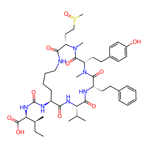 | SMILES | CC[C@H](C)[C@@H](C(=O)O)NC(=O)N[C@H]1CCCCNC(=O)[C@@H](N(C(=O)[C@@H](N(C(=O)[C@@H](NC(=O)[C@@H](NC1=O)C(C)C)CCC2=CC=CC=C2)C)CCC3=CC=C(C=C3)O)C)CCS(=O)C |
