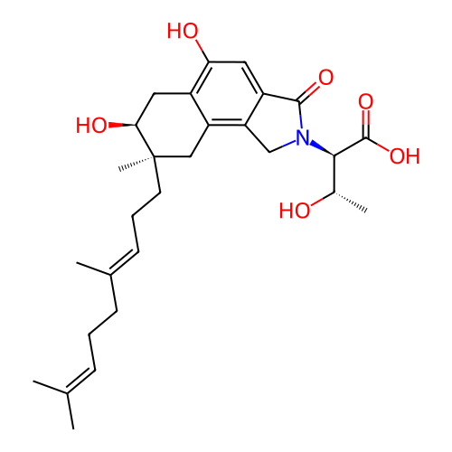 | InChI | InChI=1S/C28H39NO6/c1-16(2)8-6-9-17(3)10-7-11-28(5)14-21-19(13-24(28)32)23(31)12-20-22(21)15-29(26(20)33)25(18(4)30)27(34)35/h8,10,12,18,24-25,30-32H,6-7,9,11,13-15H2,1-5H3,(H,34,35)/b17-10+/t18-,24-,25+,28+/m0/s1 |