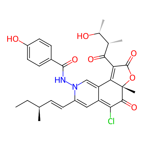 | SMILES | CC[C@H](C)C=CC1=CC2=C(C(=O)[C@@]3(C(=C(C(=O)O3)C(=O)[C@@H](C)[C@@H](C)O)C2=CN1NC(=O)C4=CC=C(C=C4)O)C)Cl |