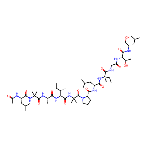 | SMILES | CC[C@H](C)[C@@H](C(=O)NC(C)(C)C(=O)N1CCC[C@H]1C(=O)N[C@@H](CC(C)C)C(=O)N[C@@](C)(CC)C(=O)NCC(=O)N[C@@H]([C@@H](C)O)C(=O)N[C@@H](CC(C)C)CO)NC(=O)[C@H](C)NC(=O)C(C)(C)NC(=O)[C@H](CC(C)C)NC(=O)C |