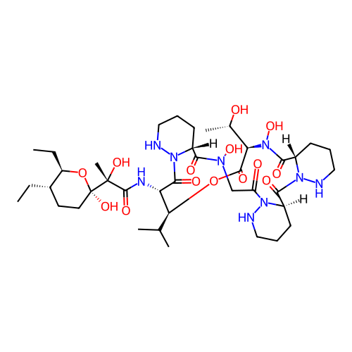 | SMILES | CC[C@H]1CC[C@@](O[C@@H]1CC)([C@@](C)(C(=O)N[C@H]2[C@@H](OC(=O)[C@H](N(C(=O)[C@@H]3CCCNN3C(=O)[C@H]4CCCNN4C(=O)CN(C(=O)[C@H]5CCCNN5C2=O)O)O)[C@H](C)O)C(C)C)O)O |