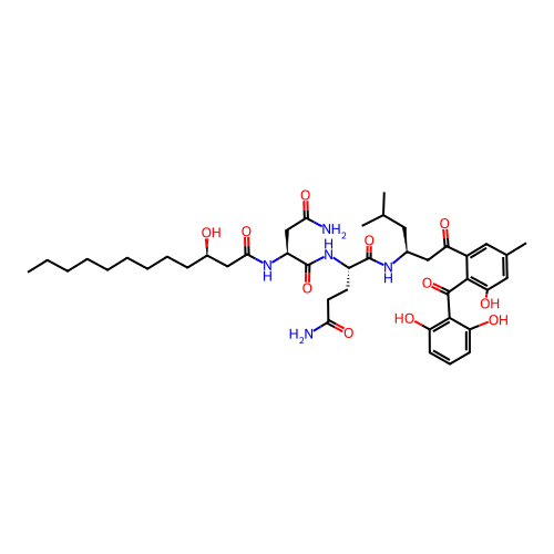 | SMILES | CCCCCCCCC[C@H](CC(=O)N[C@@H](CC(=O)N)C(=O)N[C@@H](CCC(=O)N)C(=O)N[C@@H](CC(C)C)CC(=O)C1=CC(=CC(=C1C(=O)C2=C(C=CC=C2O)O)O)C)O |