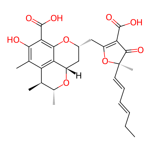 | InChI | InChI=1S/C28H32O9/c1-6-7-8-9-10-28(5)25(30)21(26(31)32)18(37-28)12-16-11-17-20-19(13(2)15(4)35-17)14(3)23(29)22(27(33)34)24(20)36-16/h7-10,13,15-17,29H,6,11-12H2,1-5H3,(H,31,32)(H,33,34)/b8-7+,10-9+/t13-,15-,16+,17+,28-/m1/s1 |