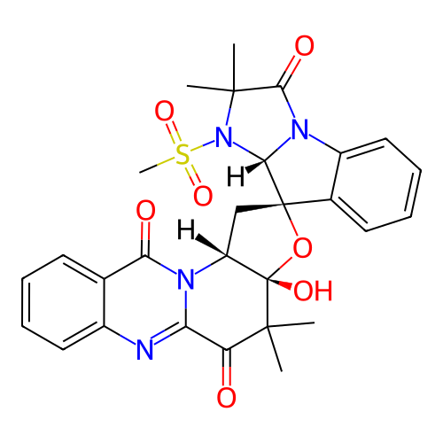 | SMILES | CC1(C(=O)C2=NC3=CC=CC=C3C(=O)N2[C@H]4[C@@]1(O[C@]5(C4)[C@H]6N(C7=CC=CC=C57)C(=O)C(N6S(=O)(=O)C)(C)C)O)C |