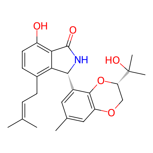 | InChI | InChI=1S/C25H29NO5/c1-13(2)6-7-15-8-9-17(27)21-20(15)22(26-24(21)28)16-10-14(3)11-18-23(16)31-19(12-30-18)25(4,5)29/h6,8-11,19,22,27,29H,7,12H2,1-5H3,(H,26,28)/t19-,22+/m0/s1 |