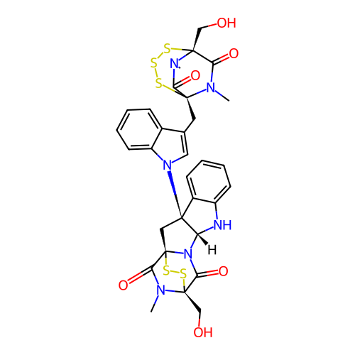 | SMILES | CN1C(=O)[C@@]2(N(C(=O)[C@]1(SSS2)CC3=CN(C4=CC=CC=C43)[C@]56C[C@@]78C(=O)N([C@@](C(=O)N7[C@H]5NC9=CC=CC=C69)(SS8)CO)C)C)CO |