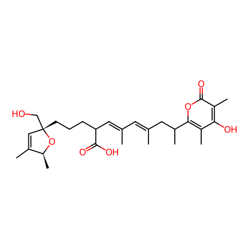 | InChI | InChI=1S/C28H40O7/c1-16(12-18(3)25-20(5)24(30)21(6)27(33)34-25)11-17(2)13-23(26(31)32)9-8-10-28(15-29)14-19(4)22(7)35-28/h11,13-14,18,22-23,29-30H,8-10,12,15H2,1-7H3,(H,31,32)/t18?,22-,23?,28+/m0/s1 |