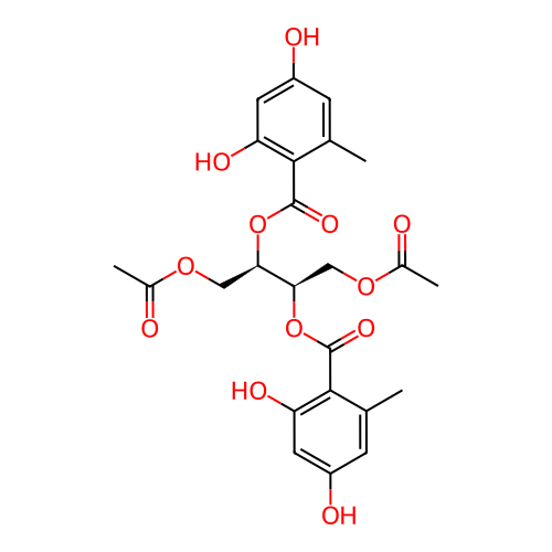 | InChI | InChI=1S/C24H26O12/c1-11-5-15(27)7-17(29)21(11)23(31)35-19(9-33-13(3)25)20(10-34-14(4)26)36-24(32)22-12(2)6-16(28)8-18(22)30/h5-8,19-20,27-30H,9-10H2,1-4H3/t19-,20-/m1/s1 |