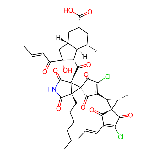 | SMILES | CCCCCC[C@@]12C(=O)NC(=O)[C@@]1([C@]23C(=O)C(=C(C3=O)Cl)[C@H]4[C@@H]([C@@]45C(=O)C(=C(C5=O)Cl)/C=C/C)C)C(=O)[C@H]6[C@@H]7[C@H](C[C@H](C[C@H]7C[C@@]6(C(=O)/C=C/C)O)C(=O)O)C |