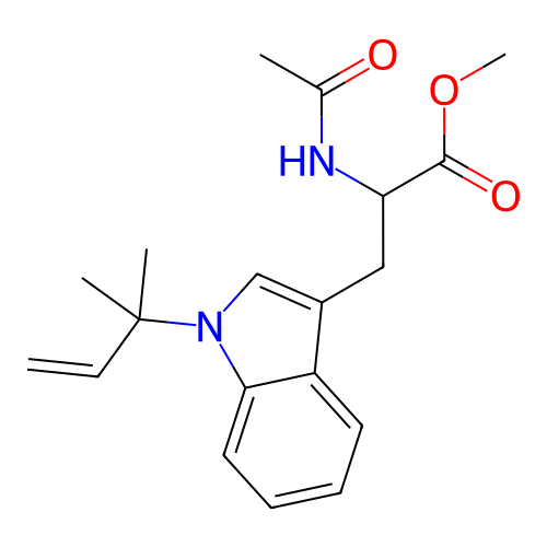 | SMILES | CC(=O)NC(CC1=CN(C2=CC=CC=C21)C(C)(C)C=C)C(=O)OC |