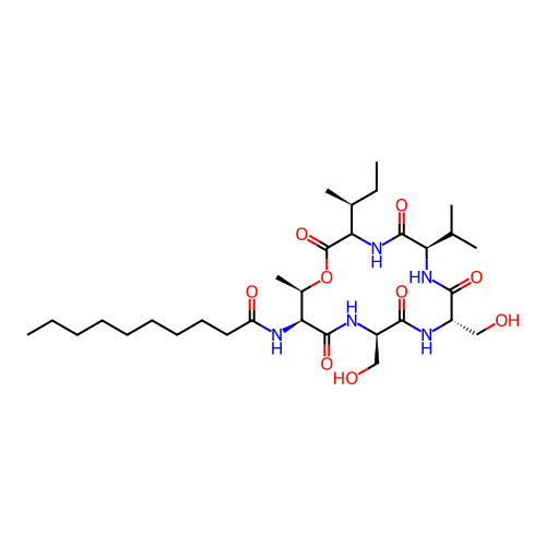 | SMILES | CCCCCCCCCC(=O)N[C@H]1[C@H](OC(=O)C(NC(=O)[C@H](NC(=O)[C@@H](NC(=O)[C@H](NC1=O)CO)CO)C(C)C)[C@@H](C)CC)C |