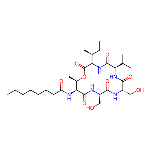 | SMILES | CCCCCCCC(=O)N[C@H]1[C@H](OC(=O)C(NC(=O)[C@H](NC(=O)[C@@H](NC(=O)[C@H](NC1=O)CO)CO)C(C)C)[C@@H](C)CC)C |