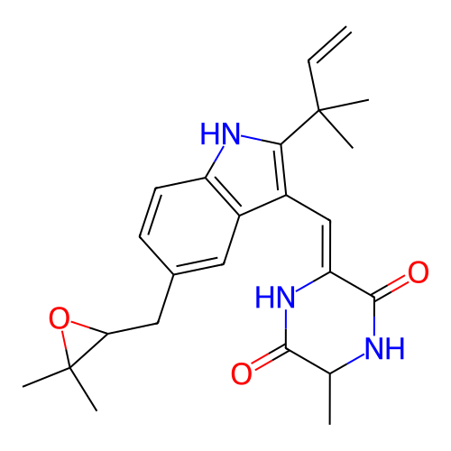 | SMILES | CC1C(=O)N/C(=C\C2=C(NC3=C2C=C(C=C3)CC4C(O4)(C)C)C(C)(C)C=C)/C(=O)N1 |
