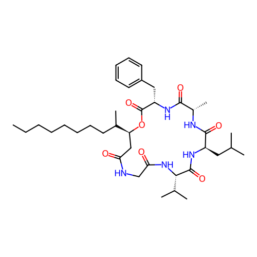 | SMILES | CCCCCCCCC(C)[C@@H]1CC(=O)NCC(=O)N[C@H](C(=O)N[C@@H](C(=O)N[C@H](C(=O)N[C@H](C(=O)O1)CC2=CC=CC=C2)C)CC(C)C)C(C)C |