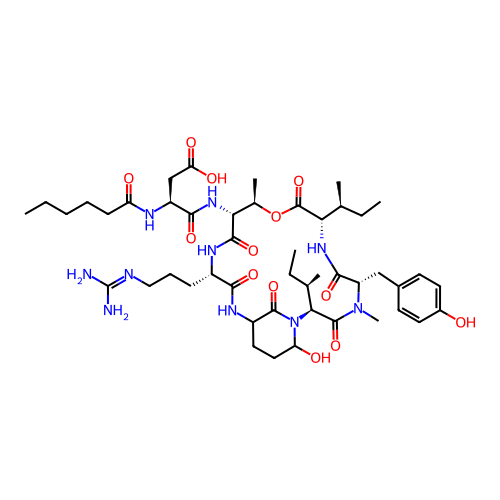 | SMILES | CCCCCC(=O)N[C@@H](CC(=O)O)C(=O)N[C@@H]1[C@H](OC(=O)[C@@H](NC(=O)[C@@H](N(C(=O)[C@@H](N2C(CCC(C2=O)NC(=O)[C@@H](NC1=O)CCCN=C(N)N)O)[C@H](C)CC)C)CC3=CC=C(C=C3)O)[C@@H](C)CC)C |