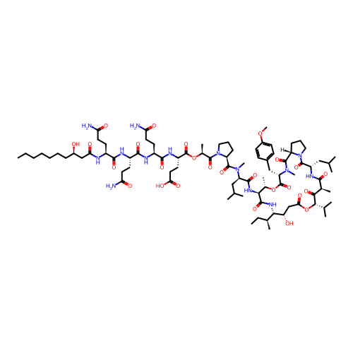 | SMILES | CCCCCCC[C@H](CC(=O)N[C@@H](CCC(=O)N)C(=O)N[C@@H](CCC(=O)N)C(=O)N[C@@H](CCC(=O)N)C(=O)N[C@@H](CCC(=O)O)C(=O)O[C@@H](C)C(=O)N1CCC[C@H]1C(=O)N(C)[C@H](CC(C)C)C(=O)N[C@H]2[C@@H](OC(=O)[C@@H](N(C(=O)[C@@H]3CCCN3C(=O)[C@@H](NC(=O)[C@H](C(=O)[C@@H](OC(=O)C[C@@H]([C@@H](NC2=O)[C@@H](C)CC)O)C(C)C)C)CC(C)C)C)CC4=CC=C(C=C4)OC)C)O |