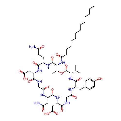 | SMILES | CCCCCCCCCCCCCC(=O)N[C@H]1C(OC(=O)[C@@H](NC(=O)[C@@H](NC(=O)CNC(=O)[C@@H](NC(=O)[C@@H](NC(=O)CNC(=O)[C@@H](NC(=O)[C@H](NC1=O)CCC(=O)N)CC(=O)O)CC(=O)N)CC(=O)O)CC2=CC=C(C=C2)O)C(C)C)C |