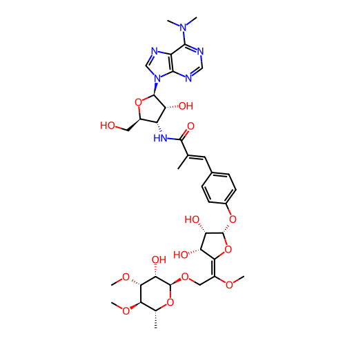 | SMILES | C[C@@H]1[C@H]([C@@H]([C@@H]([C@H](O1)OC/C(=C/2\[C@@H]([C@@H]([C@@H](O2)OC3=CC=C(C=C3)/C=C(\C)/C(=O)N[C@@H]4[C@H](O[C@H]([C@@H]4O)N5C=NC6=C5N=CN=C6N(C)C)CO)O)O)/OC)O)OC)OC |