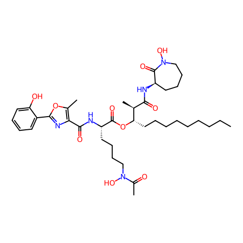 | SMILES | CCCCCCCCC[C@@H]([C@@H](C)C(=O)N[C@@H]1CCCCN(C1=O)O)OC(=O)[C@H](CCCCN(C(=O)C)O)NC(=O)C2=C(OC(=N2)C3=CC=CC=C3O)C |