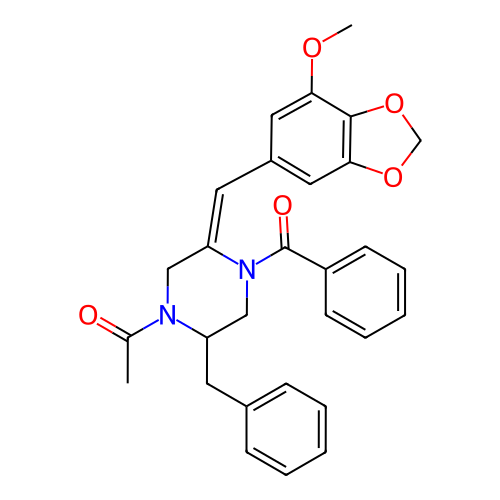 | SMILES | CC(=O)N1C/C(=C/C2=CC3=C(C(=C2)OC)OCO3)/N(CC1CC4=CC=CC=C4)C(=O)C5=CC=CC=C5 |