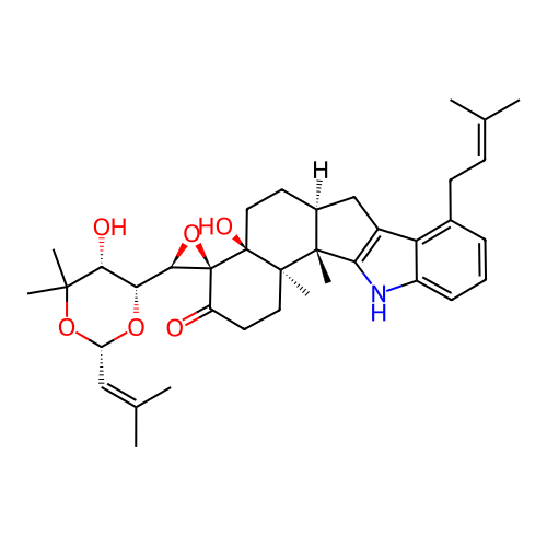 | InChI | InChI=1S/C37H49NO6/c1-20(2)12-13-22-10-9-11-25-28(22)24-19-23-14-17-36(41)34(7,35(23,8)30(24)38-25)16-15-26(39)37(36)32(44-37)29-31(40)33(5,6)43-27(42-29)18-21(3)4/h9-12,18,23,27,29,31-32,38,40-41H,13-17,19H2,1-8H3/t23-,27-,29+,31+,32+,34+,35+,36-,37-/m0/s1 |