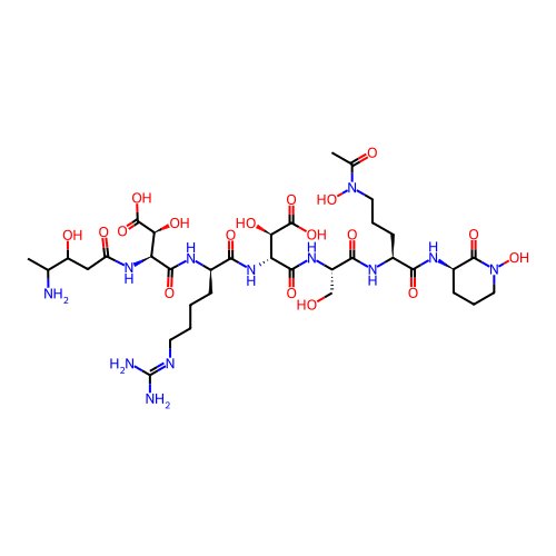 | SMILES | CC(C(CC(=O)N[C@@H]([C@@H](C(=O)O)O)C(=O)N[C@H](CCCCN=C(N)N)C(=O)N[C@H]([C@H](C(=O)O)O)C(=O)N[C@@H](CO)C(=O)N[C@@H](CCCN(C(=O)C)O)C(=O)N[C@@H]1CCCN(C1=O)O)O)N |