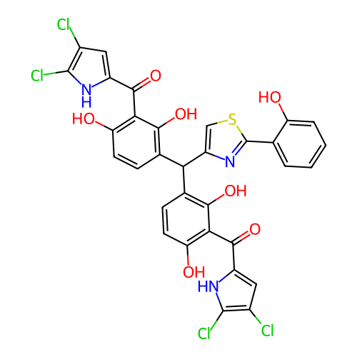 | SMILES | C1=CC=C(C(=C1)C2=NC(=CS2)C(C3=C(C(=C(C=C3)O)C(=O)C4=CC(=C(N4)Cl)Cl)O)C5=C(C(=C(C=C5)O)C(=O)C6=CC(=C(N6)Cl)Cl)O)O |