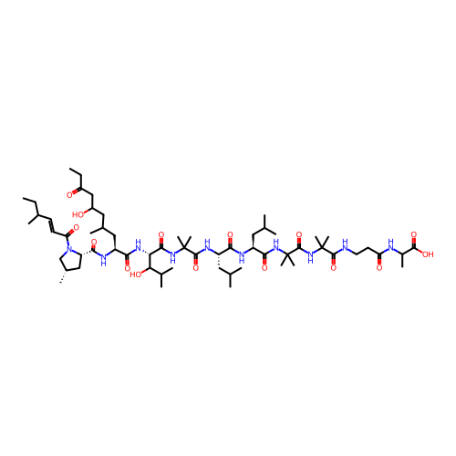 | InChI | InChI=1S/C60H104N10O15/c1-19-35(9)21-22-46(74)70-31-37(11)29-44(70)52(79)64-43(28-36(10)27-40(72)30-39(71)20-2)50(77)66-47(48(75)34(7)8)53(80)68-59(15,16)56(84)65-41(25-32(3)4)49(76)63-42(26-33(5)6)51(78)67-60(17,18)57(85)69-58(13,14)55(83)61-24-23-45(73)62-38(12)54(81)82/h21-22,32-38,40-44,47-48,72,75H,19-20,23-31H2,1-18H3,(H,61,83)(H,62,73)(H,63,76)(H,64,79)(H,65,84)(H,66,77)(H,67,78)(H,68,80)(H,69,85)(H,81,82)/t35?,36?,37-,38?,40?,41-,42-,43-,44-,47-,48?/m0/s1 |