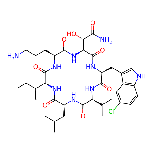 | SMILES | CC[C@H](C)[C@H]1C(=O)N[C@H](C(=O)N[C@H](C(=O)N[C@H](C(=O)N[C@H](C(=O)N[C@H](C(=O)N1)CC(C)C)C(C)C)CC2=CNC3=C2C=C(C=C3)Cl)[C@@H](C(=O)N)O)CCCN |