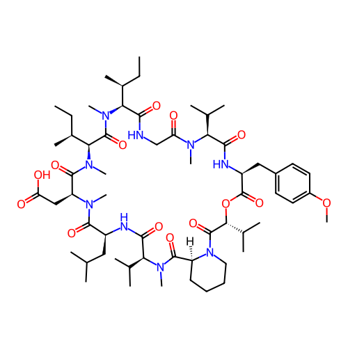 | SMILES | CC[C@H](C)[C@H]1C(=O)NCC(=O)N([C@H](C(=O)N[C@H](C(=O)O[C@@H](C(=O)N2CCCC[C@H]2C(=O)N([C@H](C(=O)N[C@H](C(=O)N([C@H](C(=O)N([C@H](C(=O)N1C)[C@@H](C)CC)C)CC(=O)O)C)CC(C)C)C(C)C)C)C(C)C)CC3=CC=C(C=C3)OC)C(C)C)C |