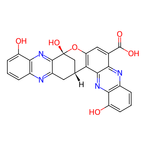 | 2 | O=C(O)C1=CC2=C(C3=NC4=C(C=CC=C4O)N=C13)[C@@H]1CC3=NC4=C(N=C3[C@@](O)(C1)O2)C(O)=CC=C4 | Zhuang, Yihao; Yang, Fei; Menon, Arya; Song, James M; Espinoza, Rosa V; Schultz, Pamela J; Garner, Amanda L; Tripathi, Ashootosh An ECD and NMR/DP4+ Computational Pipeline for Structure Revision and Elucidation of Diphenazine-Based Natural Products. Journal of Natural Products 2023 86 (7) 1801-1814. DOI: 10.1021/acs.jnatprod.3c00306 PMID: 37463274 | ||