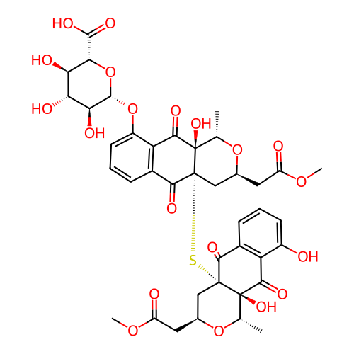 | SMILES | C[C@H]1[C@]2(C(=O)C3=C(C=CC=C3O)C(=O)[C@@]2(C[C@@H](O1)CC(=O)OC)S[C@@]45C[C@@H](O[C@H]([C@]4(C(=O)C6=C(C5=O)C=CC=C6O[C@@H]7[C@H]([C@@H]([C@H]([C@@H](O7)C(=O)O)O)O)O)O)C)CC(=O)OC)O |