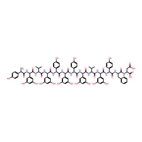 | SMILES | CC(C)C(C(=O)NC(C1=CC(=CC(=C1)O)O)C(=O)NC(C2=CC=C(C=C2)O)C(=O)NC(C3=CC(=CC(=C3)O)O)C(=O)NC(C4=CC=C(C=C4)O)C(=O)NC(C5=CC(=CC(=C5)O)O)C(=O)NC(C(C)C)C(=O)NC(C6=CC(=CC(=C6)O)O)C(=O)NC(C7=CC=C(C=C7)O)C(=O)NC(CC8=CC=CC=C8)C(=O)NC(CC(=O)O)C(=O)O)NC(=O)C(C9=CC(=CC(=C9)O)O)NC(=O)C(C1=CC=C(C=C1)O)N |