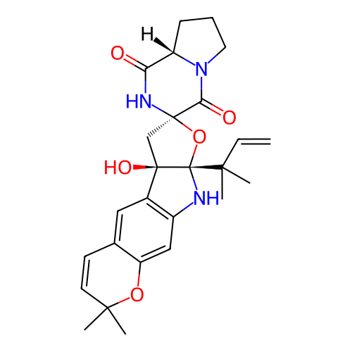| 2 | C=CC(C)(C)[C@@]12NC3=C(C=C4C=CC(C)(C)OC4=C3)[C@]1(O)C[C@@]1(NC(=O)[C@@H]3CCCN3C1=O)O2 | Khong, Quan T; Smith, Emily A; Wendt, Karen L; Dalilian, Masoumeh; Goncharova, Ekaterina I; Brownell, Isaac; Cichewicz, Robert H; Henrich, Curtis J; Beutler, John A; O'Keefe, Barry R; Du, Lin Chemoreactive 2,5-Diketopiperazines from a Penicillium sp., Structure Revision of Reported Analogues and Proposed Facile Transformation Pathways. Journal of Natural Products 2024 87 (7) 1826-1837. DOI: 10.1021/acs.jnatprod.4c00478 PMID: 38995621 | ||