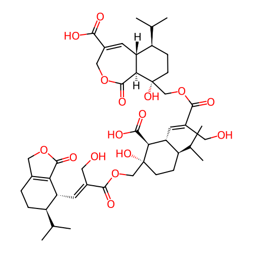 | InChI | InChI=1S/C45H62O16/c1-22(2)29-8-7-25-18-58-42(54)35(25)32(29)13-26(16-46)40(52)60-20-44(56)11-9-30(23(3)4)33(36(44)39(50)51)14-27(17-47)41(53)61-21-45(57)12-10-31(24(5)6)34-15-28(38(48)49)19-59-43(55)37(34)45/h13-15,22-24,29-34,36-37,46-47,56-57H,7-12,16-21H2,1-6H3,(H,48,49)(H,50,51)/b26-13+,27-14+/t29-,30-,31-,32-,33-,34-,36-,37-,44-,45-/m1/s1 |