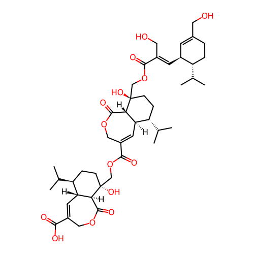 | InChI | InChI=1S/C44H62O14/c1-23(2)31-8-7-26(17-45)13-27(31)14-28(18-46)39(49)57-21-43(53)12-10-33(25(5)6)35-16-30(20-56-42(52)37(35)43)40(50)58-22-44(54)11-9-32(24(3)4)34-15-29(38(47)48)19-55-41(51)36(34)44/h13-16,23-25,27,31-37,45-46,53-54H,7-12,17-22H2,1-6H3,(H,47,48)/b28-14+/t27-,31-,32-,33-,34-,35-,36-,37-,43-,44-/m1/s1 |