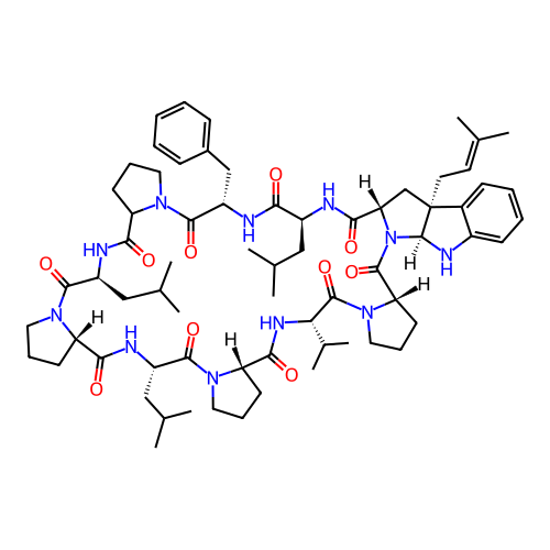 | SMILES | CC(C)C[C@H]1C(=O)N[C@H](C(=O)N2CCCC2C(=O)N[C@H](C(=O)N3CCC[C@H]3C(=O)N[C@H](C(=O)N4CCC[C@H]4C(=O)N[C@H](C(=O)N5CCC[C@H]5C(=O)N6[C@@H](C[C@@]7([C@H]6NC8=CC=CC=C87)CC=C(C)C)C(=O)N1)C(C)C)CC(C)C)CC(C)C)CC9=CC=CC=C9 |