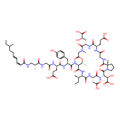 | SMILES | CCC(C)CC/C=C/C=C\C(=O)NC[C@@H](C)C(=O)NCC(=O)N[C@H](CCC(=O)O)C(=O)N[C@@H](CC1=CC=C(O)C=C1)C(=O)N[C@@H]1C(=O)N[C@H]([C@H](C)CC)C(=O)N[C@@H](CC(=O)O)C(=O)N[C@@H]([C@@H](O)C(=O)O)C(=O)N2CCC[C@H]2C(=O)NCC(=O)N[C@H](CCC(=O)O)C(=O)N[C@@H](C[C@@H](O)C(=O)O)C(=O)N(C)CC(=O)O[C@@H]1C |