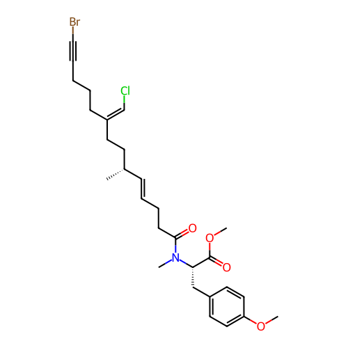 | SMILES | COC(=O)[C@H](CC1=CC=C(OC)C=C1)N(C)C(=O)CCC=C[C@H](C)CCC(=CCl)CCCC#CBr |